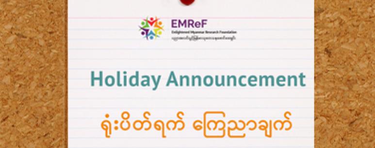 EMReF the whole office will be closed from Saturday, 23rd December 2017 to Monday, 1st January 2018 for New Year Holidays. During this holiday period, we will have intermittent email access, and may not get back to you until Monday, 1st January 2018. We will reply the email when reopen on Tuesday, 2nd January 2018.